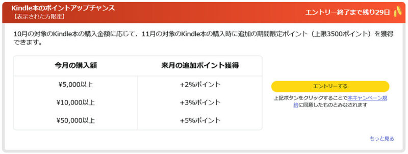今月 5,000円以上のKindle本を購入すると、来月のKindle本の購入時に 2~5% の追加還元が得られます。