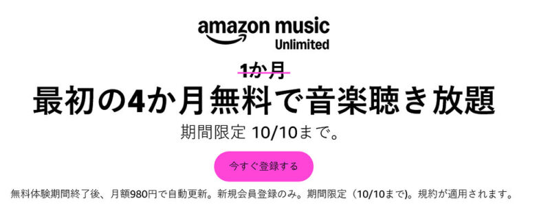 - Amazon Music Unlimited が 4ヶ月無料キャンペーン