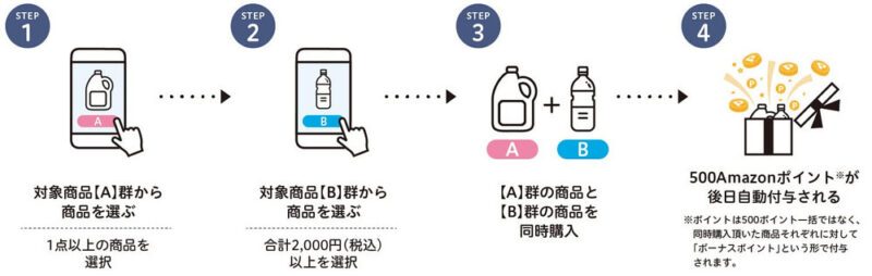 対象のA群とB群からそれぞれ1点以上を選び、合計2,000円以上を購入すると 500ポイントが還元されるキャンペーンです。