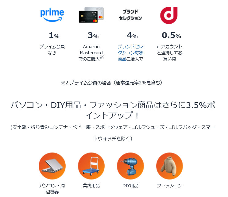 「ポイントアップキャンペーン」でプライム会員かつ Amazon MasterCard を使うと +3% 還元になりますが、ペイディでも 3% にできます。むしろペイディの方が条件が金額だけなので楽かも知れません。