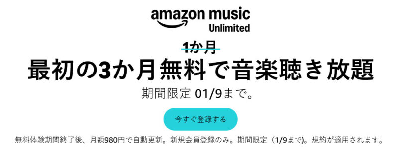 - Amazon Music Unlimited が3ヶ月無料。ファミリープランも3ヶ月無料