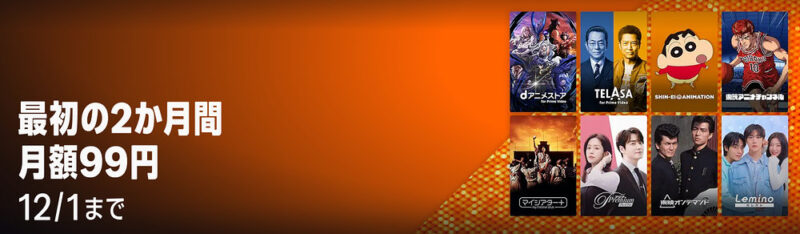 - Prime Video で対象のチャンネルが2ヶ月・月額99円。プライム会員限定のセールも