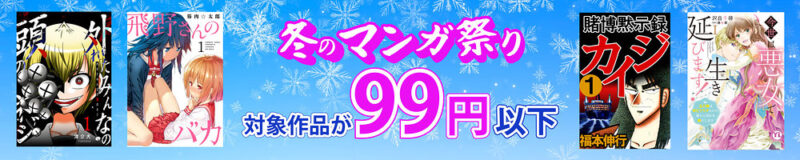 Kindleストアで「冬のマンガ祭り2025」が始まりました。マンガが99円以下にセールされています。