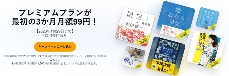 本の朗読サービス「Audible」で3ヶ月・月額99円キャンペーンが行なわれています。