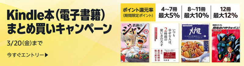 現在、「まとめ買いキャンペーン」と、「新生活セール」の「ポイントアップキャンペーン」がありますのでエントリーしておきましょう。