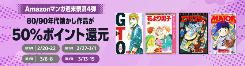 Kindleストアで「マンガ週末祭 第4弾」開始。「80~90年代懐かし作品」が50%還元+まとめ買いで12%還元。「寄生獣」「ヨコハマ買い出し紀行」「攻殻機動隊」など セールマンガ・アニメ終了 2026.03.13 他に「今日から俺は!!」「HELLSING」「ヒカルの碁」「狂四郎2030」「機動警察パトレイバー」「柔道部物語」「蒼天航路」「BASTARD!!」など Kindleストアで「Amazonマンガ週末祭 第4弾」が始まりました。 今回は「80/90年代懐かし作品」が 50% 還元です。 現在「まとめ買いキャンペーン」で最大 12% 還元がありますので、これと組み合わせて 50+12 = 62% 還元になります。 寄生獣(1) (アフタヌーンコミックス)1990-7-23 / 講談社岩明均 (著)¥792 →¥110[-86%](ポイント:55pt [50%])レビュー件数:2,836(投稿時点) Amazon 七夕の国(1) (ビッグコミックス)1997-6-30 / 小学館岩明均 (著)¥759(ポイント:380pt [50%])レビュー件数:1,180(投稿時点) Amazon ヨコハマ買い出し紀行(1) (アフタヌーンコミックス)1995-8-23 / 講談社芦奈野ひとし (著)¥792(ポイント:396pt [50%])レビュー件数:1,302(投稿時点) Amazon 攻殻機動隊(1) (ヤングマガジンコミックス)1991-10-5 / 講談社士郎正宗 (著)¥1,650(ポイント:825pt [50%])レビュー件数:2,345(投稿時点) Amazon 今日から俺は!!(1) (少年サンデーコミックス)1989-12-14 / 小学館西森博之 (著)¥0レビュー件数:1,237(投稿時点) Amazon HELLSING(1) (ヤングキングコミックス)1998-11-1 / 少年画報社平野耕太 (著)¥776(ポイント:388pt [50%])レビュー件数:1,136(投稿時点) Amazon ヒカルの碁 1 (ジャンプコミックスDIGITAL)1999-4-30 / 集英社ほったゆみ (著), 小畑健 (著)¥460(ポイント:230pt [50%])レビュー件数:1,014(投稿時点) Amazon 狂四郎2030 1 (ヤングジャンプコミックスDIGITAL)1998-4-3 / 集英社徳弘正也 (著)¥528(ポイント:264pt [50%])レビュー件数:997(投稿時点) Amazon 機動警察パトレイバー(1) (少年サンデーコミックス)1988-6-18 / 小学館ゆうきまさみ (著)¥583(ポイント:292pt [50%])レビュー件数:933(投稿時点) Amazon 柔道部物語(1) (ヤングマガジンコミックス)1987-6-15 / 講談社小林まこと (著)¥792(ポイント:396pt [50%])レビュー件数:818(投稿時点) Amazon 蒼天航路(1) (モーニングコミックス)1995-10-23 / 講談社王欣太 (著), 李學仁 (著)¥660 →¥110[-83%](ポイント:55pt [50%])レビュー件数:733(投稿時点) Amazon BASTARD!! 1 (ジャンプコミックスDIGITAL)1988-8-10 / 集英社萩原一至 (著)¥408(ポイント:204pt [50%])レビュー件数:655(投稿時点) Amazon BLAME!(1) (アフタヌーンコミックス)1998-6-20 / 講談社弐瓶勉 (著)¥792(ポイント:396pt [50%])レビュー件数:641(投稿時点) Amazon ピンポン(1) (ビッグコミックス)1996-7-30 / 小学館松本大洋 (著)¥759(ポイント:380pt [50%])レビュー件数:604(投稿時点) Amazon ポケットモンスタースペシャル(1) (てんとう虫コミックススペシャル)1997-8-8 / 小学館日下秀憲 (著), 真斗 (著)¥550(ポイント:275pt [50%])レビュー件数:603(投稿時点) Amazon ポケットモンスター(1)1996-11-28 / 小学館穴久保幸作 (著)¥495(ポイント:248pt [50%])レビュー件数:67(投稿時点) Amazon 大使閣下の料理人(1) (モーニングコミックス)1999-5-21 / 講談社西村ミツル (著), かわすみひろし (著)¥660(ポイント:330pt [50%])レビュー件数:582(投稿時点) Amazon サンクチュアリ(1) (ビッグコミックス)1990-10-30 / 小学館池上遼一 (著), 史村翔 (著)¥759(ポイント:380pt [50%])レビュー件数:565(投稿時点) Amazon 天使な小生意気(1) (少年サンデーコミックス)1999-9-18 / 小学館西森博之 (著)¥0レビュー件数:558(投稿時点) Amazon BANANA FISH(1) BANANA FISH (フラワーコミックス)1986-12-15 / 小学館吉田秋生 (著)¥583(ポイント:292pt [50%])レビュー件数:556(投稿時点) Amazon 天才柳沢教授の生活(1) (モーニングコミックス)1989-9-22 / 講談社山下和美 (著)¥792(ポイント:396pt [50%])レビュー件数:543(投稿時点) Amazon 天は赤い河のほとり(1) (フラワーコミックス)1995-5-26 / 小学館篠原千絵 (著)¥583(ポイント:292pt [50%])レビュー件数:490(投稿時点) Amazon 漂流教室〔文庫版〕(1) (少年サンデーコミックス)1998-7-17 / 小学館楳図かずお (著)¥979(ポイント:490pt [50%])レビュー件数:479(投稿時点) Amazon なるたる(1) (アフタヌーンコミックス)1998-8-21 / 講談社鬼頭莫宏 (著)¥792 →¥110[-86%](ポイント:55pt [50%])レビュー件数:472(投稿時点) Amazon ギャラリーフェイク(1) (ビッグコミックス)1992-8-29 / 小学館細野不二彦 (著)¥693(ポイント:347pt [50%])レビュー件数:463(投稿時点) Amazon 砲神エグザクソン(1) (アフタヌーンコミックス)1998-6-23 / 講談社園田健一 (著)¥792(ポイント:396pt [50%])レビュー件数:457(投稿時点) Amazon EDEN(1) (アフタヌーンコミックス)1998-4-23 / 講談社遠藤浩輝 (著)¥792(ポイント:396pt [50%])レビュー件数:451(投稿時点) Amazon 美味しんぼ(1) (ビッグコミックス)1984-11-30 / 小学館雁屋哲 (著), 花咲アキラ (著)¥759(ポイント:380pt [50%])レビュー件数:448(投稿時点) Amazon 夏子の酒(1) (モーニングコミックス)1988-12-17 / 講談社尾瀬あきら (著)¥660(ポイント:330pt [50%])レビュー件数:441(投稿時点) Amazon 笑う大天使 1 (白泉社文庫)1996-9-18 / 白泉社川原泉 (著)¥610(ポイント:305pt [50%])レビュー件数:432(投稿時点) Amazon プレイボール 1 (ジャンプコミックスDIGITAL)1996-5-1