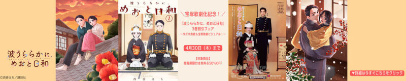このほか、「宝塚歌劇化記念!『波うららかに、めおと日和』3巻割引フェア 〜今だけ表紙も宝塚歌劇ビジュアル!〜」も始まっています。