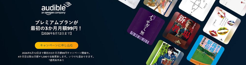 本の朗読サービス「Audible」が3ヶ月・月額99円になるキャンペーンが始まりました。