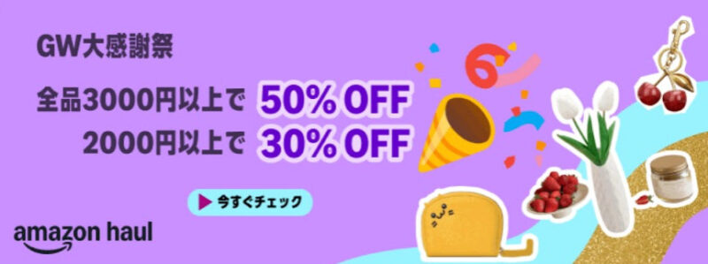 Amazon Haul で「GW大感謝祭」セールが始まり、カートの合計額が 3,000円以上で 50%OFF、2,000円以上で 30%OFF になります。