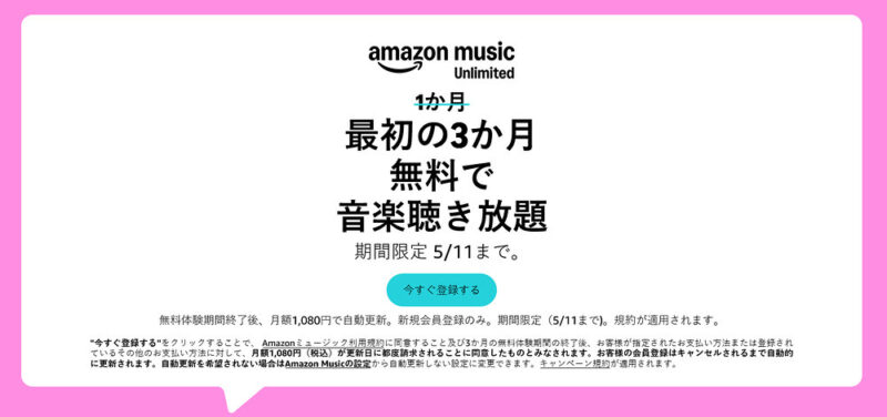 - Amazon Music Unlimited が3ヶ月無料キャンペーン