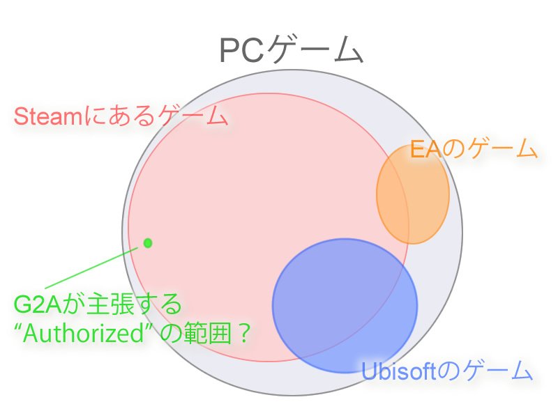 G2A は Steam で販売されているゲーム、Early Access のゲームなども含め、何かのゲームのデベロッパーやパブリッシャーと契約を結べるかもしれません。この場合、1つでも Steam で販売されているゲーム会社と契約できれば「G2A は Steam のゲームの Authorized Reseller だ」とは言えます。
