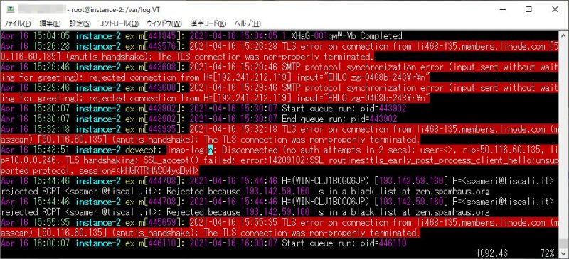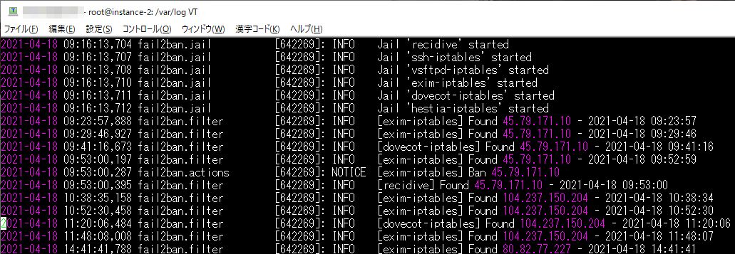 そのうえ、メールソフトウェア(exim、dovecot)のログ出力を syslog にしたらアタックを全く検出しなくなり、BANをしてくれなくなりました。rsyslog があるからログは syslog に出したいんですよね。